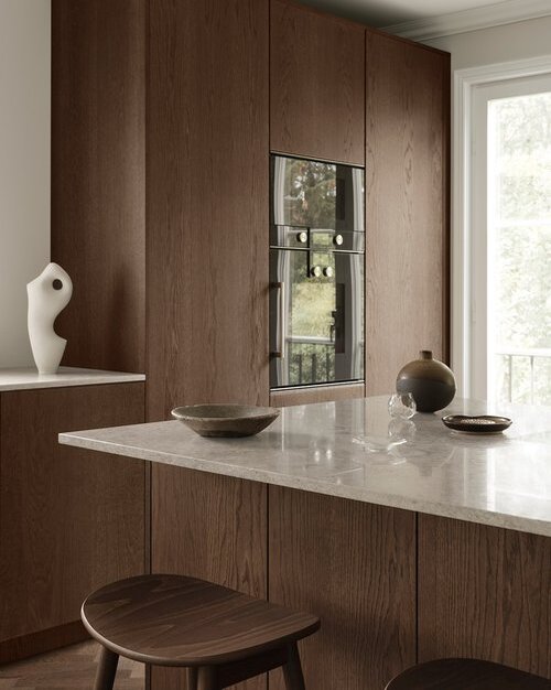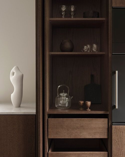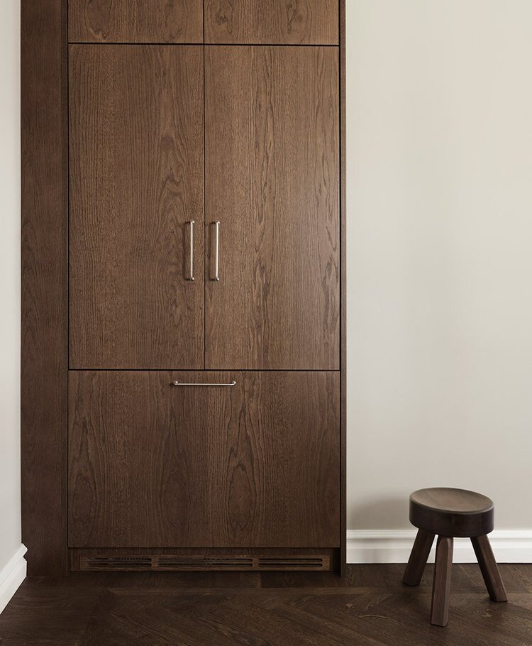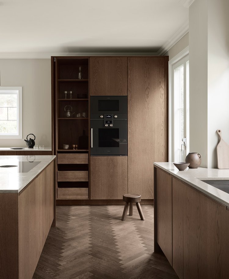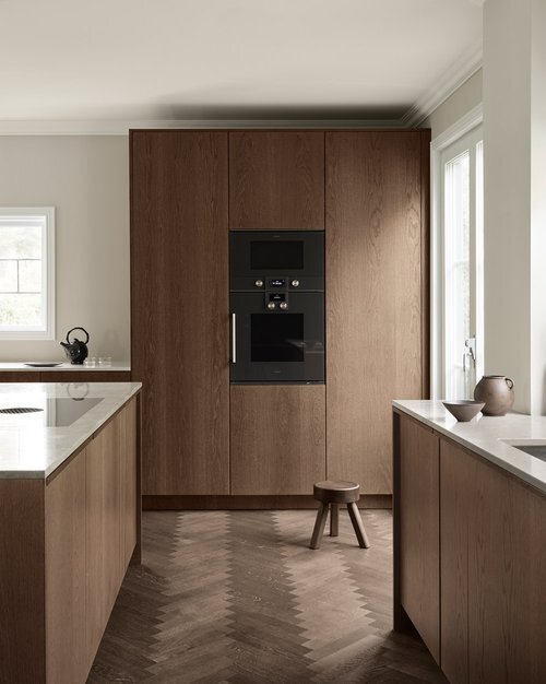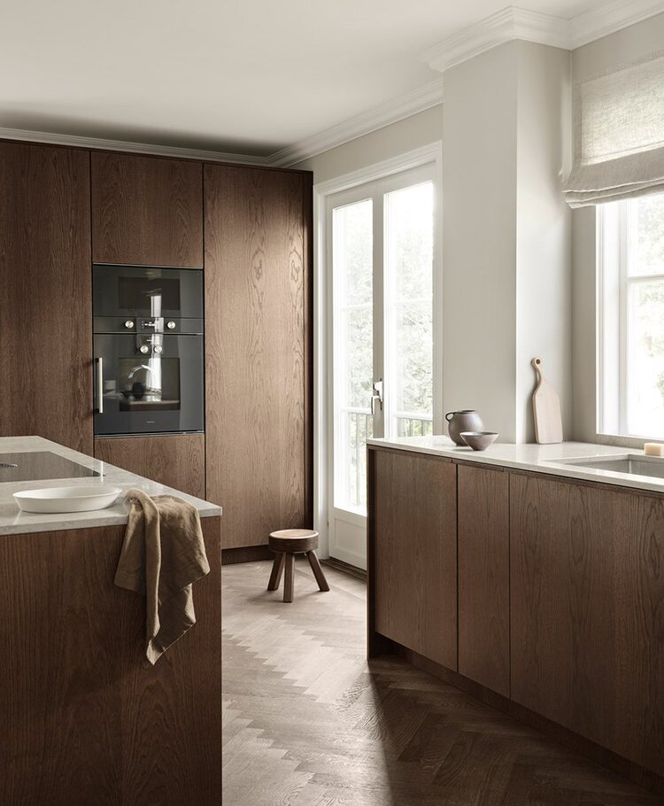 This minimalist oak wood kitchen is built in beautiful dark brown shade. To achieve a deep tone, we have applied several treatments to the wooden surfaces giving a perfect finish with wooden grains shown through created a kitchen featuring a rich, dark brown hue complemented by parquet floor.