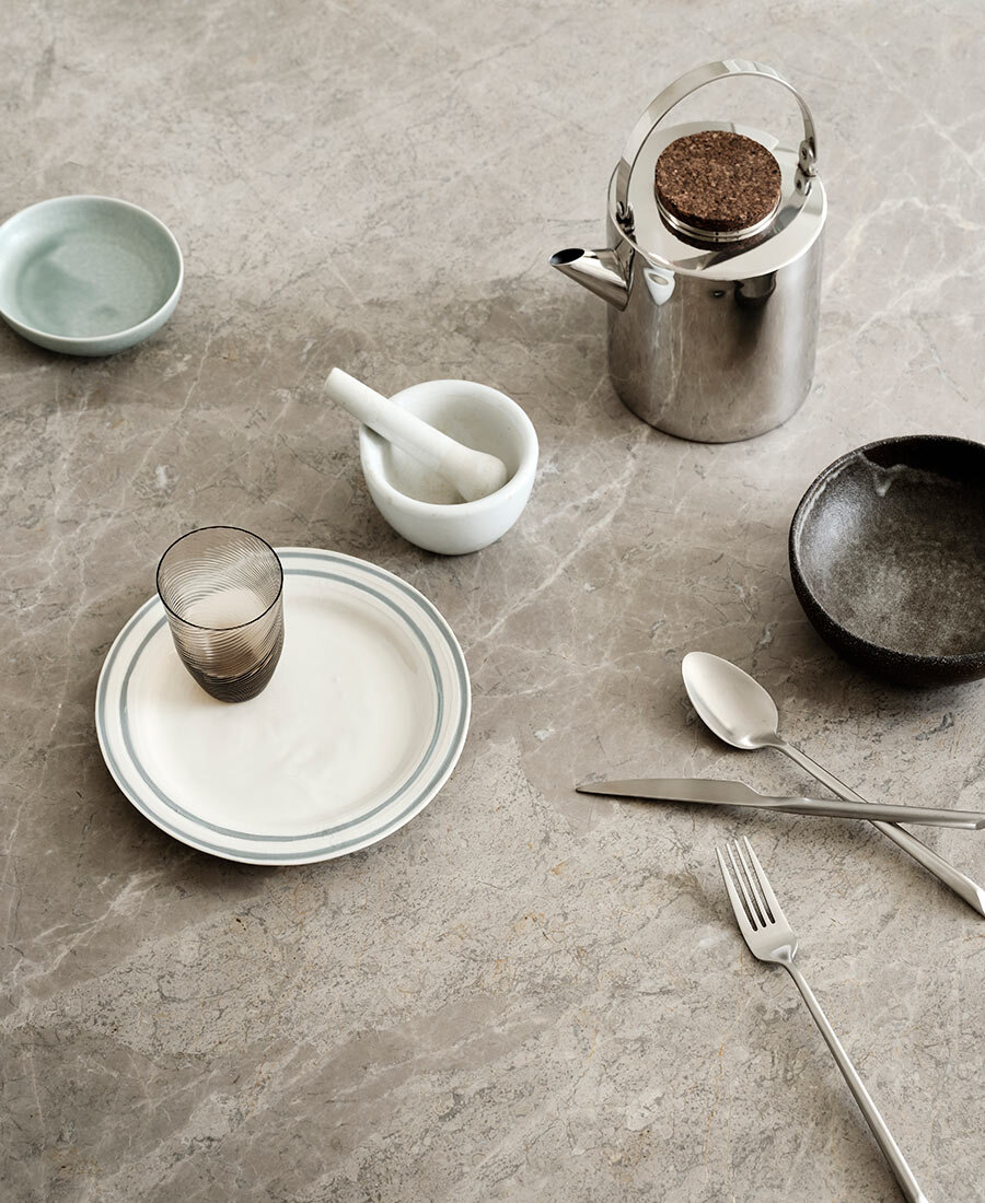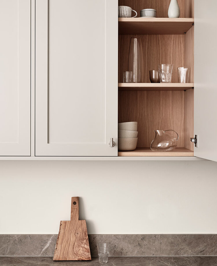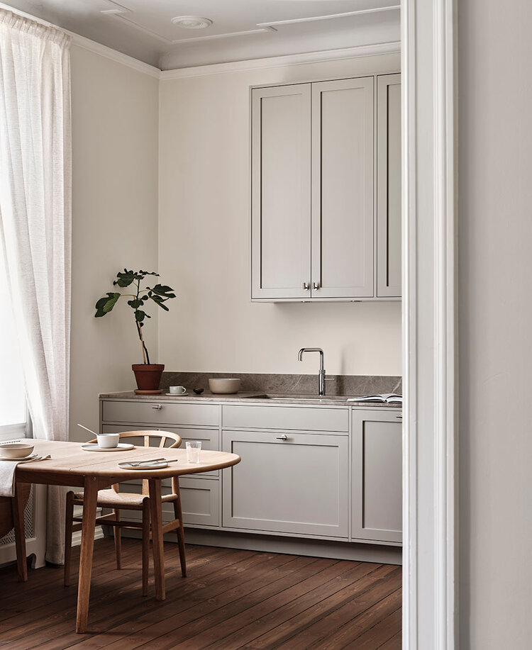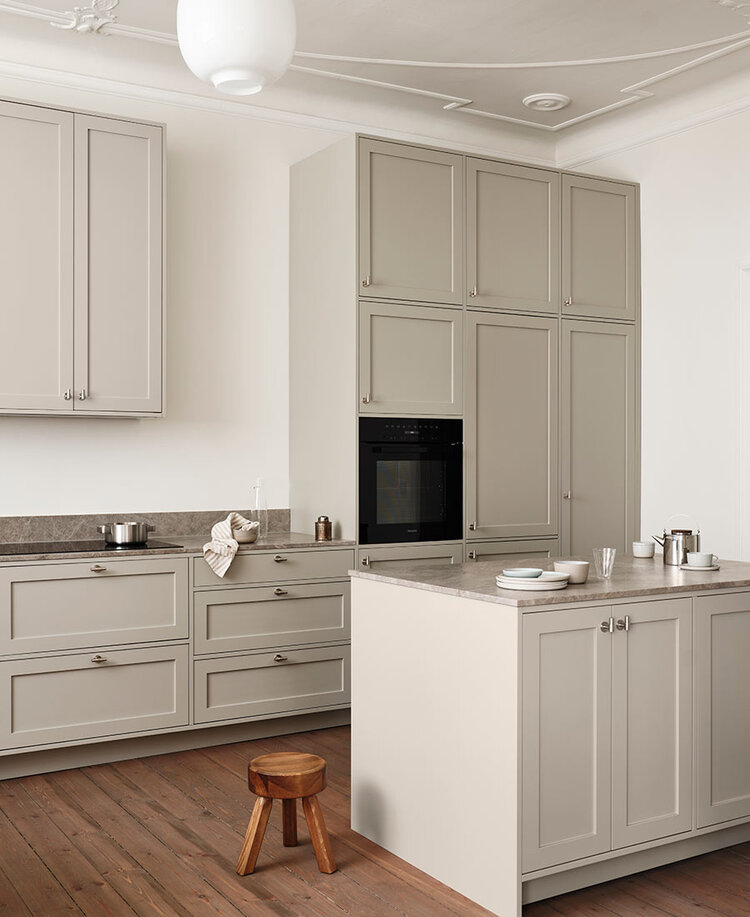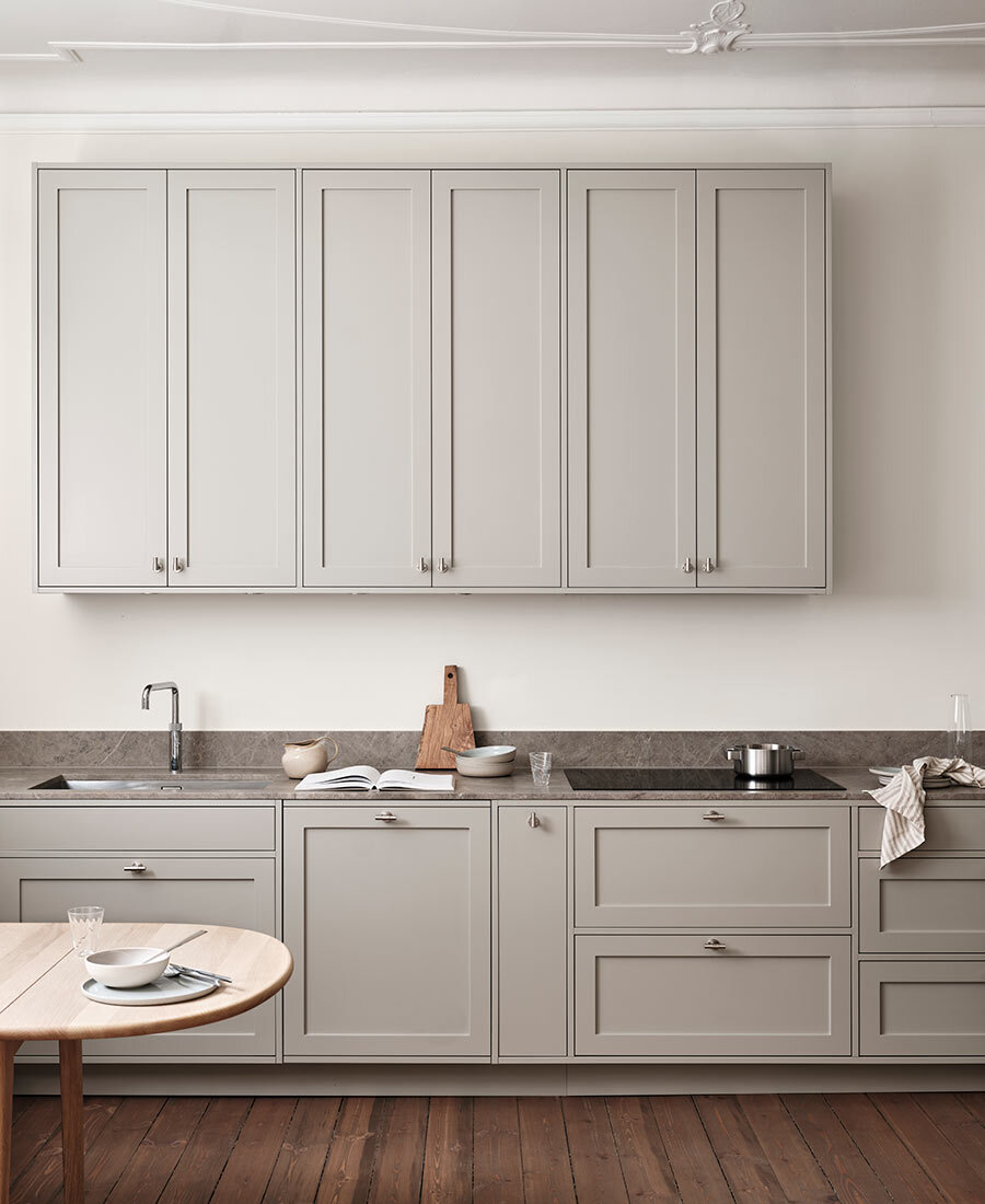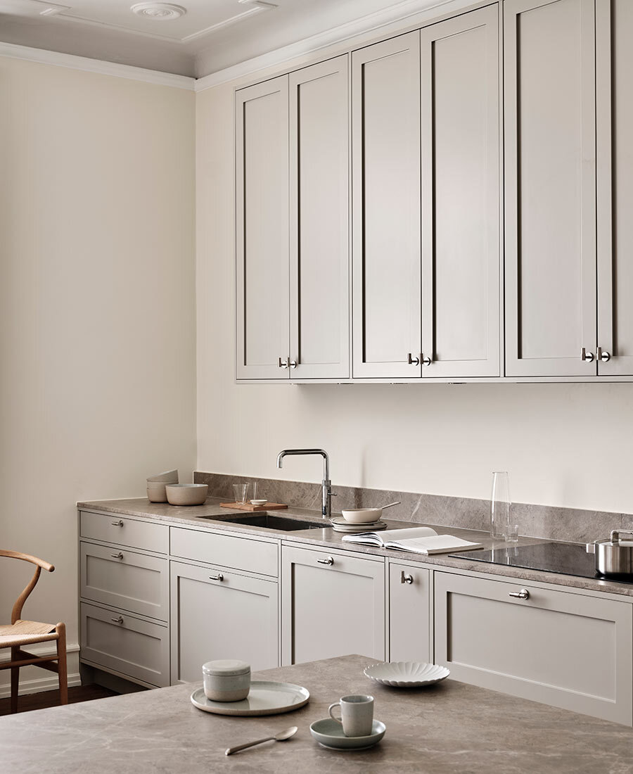 A classic Shaker Kitchen with a Scandinavian accent. The custom designed kitchen kitchen features a large bespoke island painted in light grey tones.